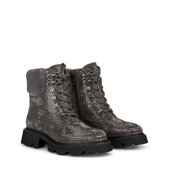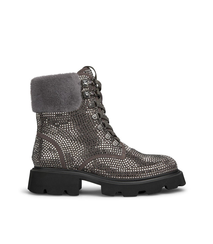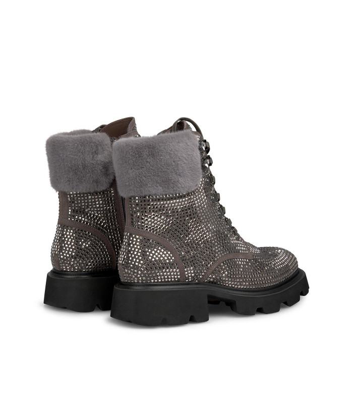 Botim Alma en Pena , em pele camurça com aplicação de brilhantes, atacadores e gola em pêlo.