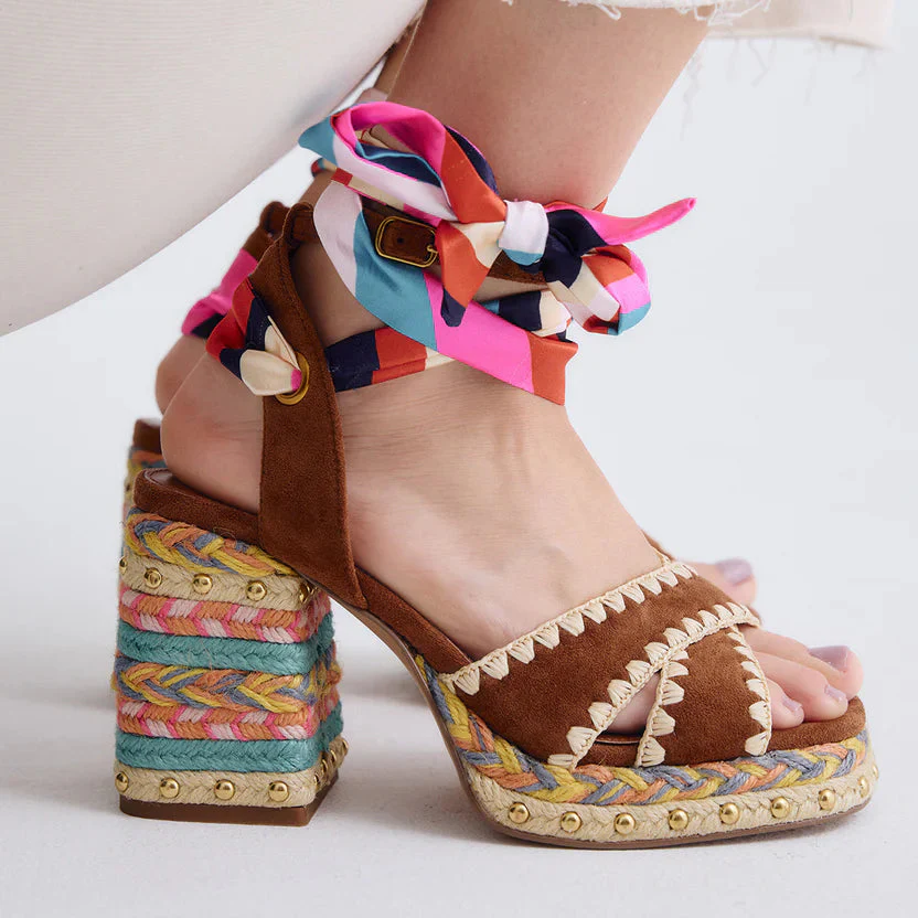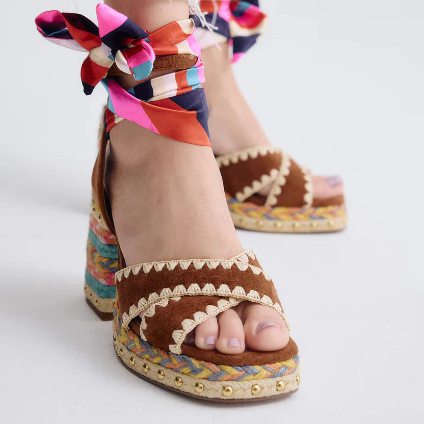 Sandálias super giras feitas em pele camurça, combinam tons vibrantes e detalhes artesanais . Laço amovivel.